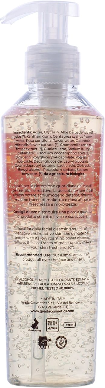 Aqua, Glycerin, Aloe Barbadensis Leaf Juice[1], Xanthan Gum, Centaurea Cyanus Flower Water, Rosa Centifolia Flower Water, Calendula Officinalis Flower Extract[1], Chamomilla Recutita (Matricaria) Flower Extract[1], Guaiazulene, Sodium Lauroyl Glutamate, Disodium Cocoamphodiacetate, Diglycerin, Polyglyceryl-4 Caprylate, Potassium Hydroxide, Decyl Glucoside, Lauryl Glucoside, Cocamidopropyl Betaine, Lactic Acid, Citricacid, Benzyl Alcohol, Potassium Sorbate, Sodium Benzoate