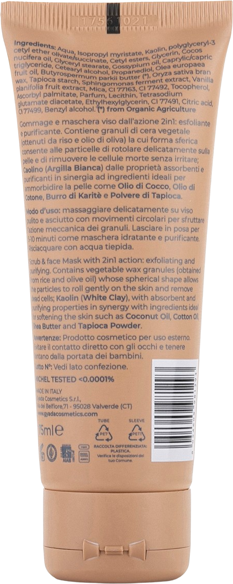 Ce masque unique purifie et exfolie la peau en une seule étape. Des billes de cire végétale - fabriquées à partir de riz et d'huile d'olive - assurent, grâce à leur forme sphérique, un effet exfoliant particulièrement doux et éliminent ainsi les cellules mortes de la peau. Le kaolin (argile blanche) a des propriétés absorbantes et nettoyantes et, en combinaison avec l'huile de coco, l'huile de coton, le beurre de karité et l'amidon de tapioca, il laisse la peau agréablement douce.