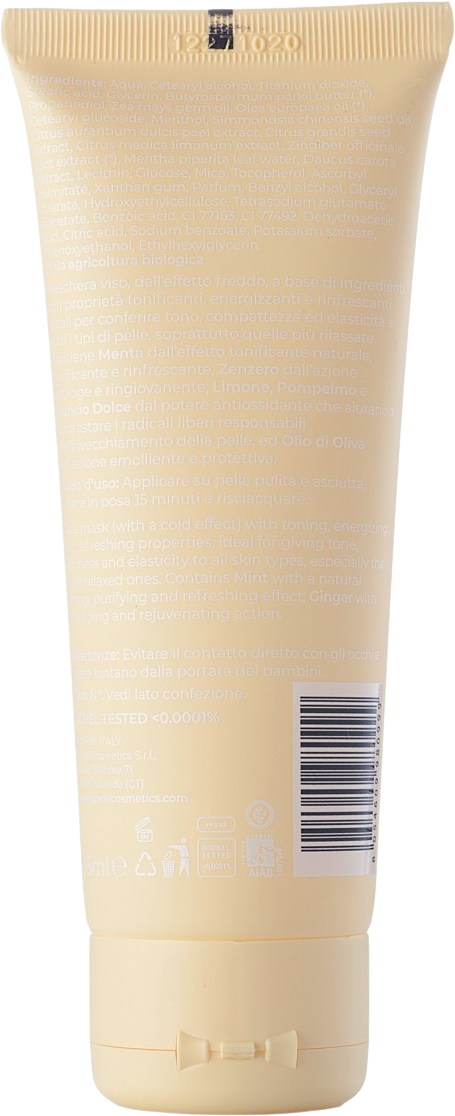 Ce masque refroidissant pour le visage raffermit la peau grâce à des ingrédients végétaux naturels. Il rafraîchit la peau et lui redonne de l'énergie. Il améliore la résistance et l'élasticité de la peau terne, et lisse le teint. Il contient de la menthe, qui a un effet rafraîchissant et clarifiant naturel. Le gingembre, en revanche, est un agent anti-âge naturel qui favorise la jeunesse de la peau. Le citron, le pamplemousse et l'orange protègent la peau contre les radicaux libres et l'huile d'olive contre les signes de l'âge.