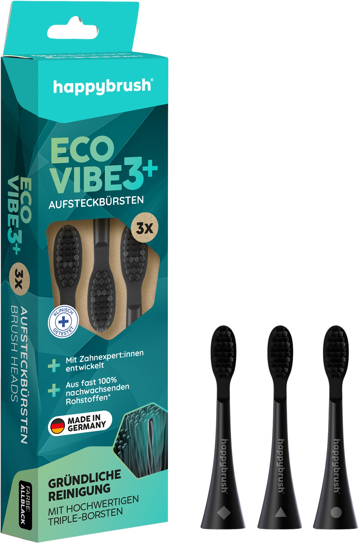 happybrush ECO VIBE 3+ Têtes de Brosse AllBlack, 3 pièces