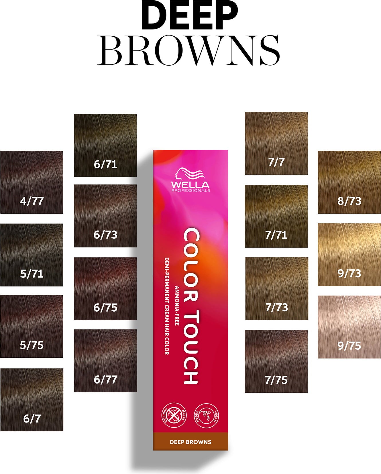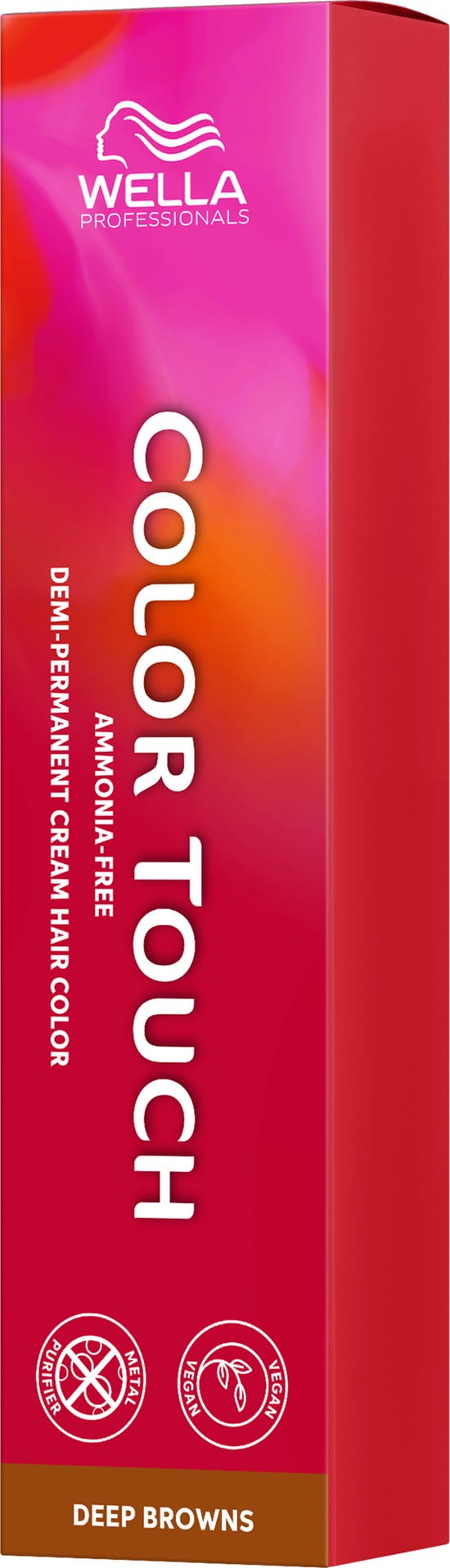 Connaissez-vous Color Touch Deep Browns avec la Metal Purifier Technology intégrée ? Ces colorations semi-permanentes professionnelles garantissent des châtains-bruns riches, à la brillance superbe. Les nuances vibrantes peuvent tenir jusqu'à 28 shampoings. La formule vegan est exempte d'ammoniaque, de silicones et d'huile minérale.
